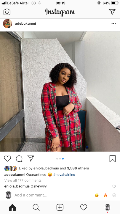 Bukunmi took to her Instagram app yesterday to share new photos with her followers and she captioned them ‘Quarantined’.
