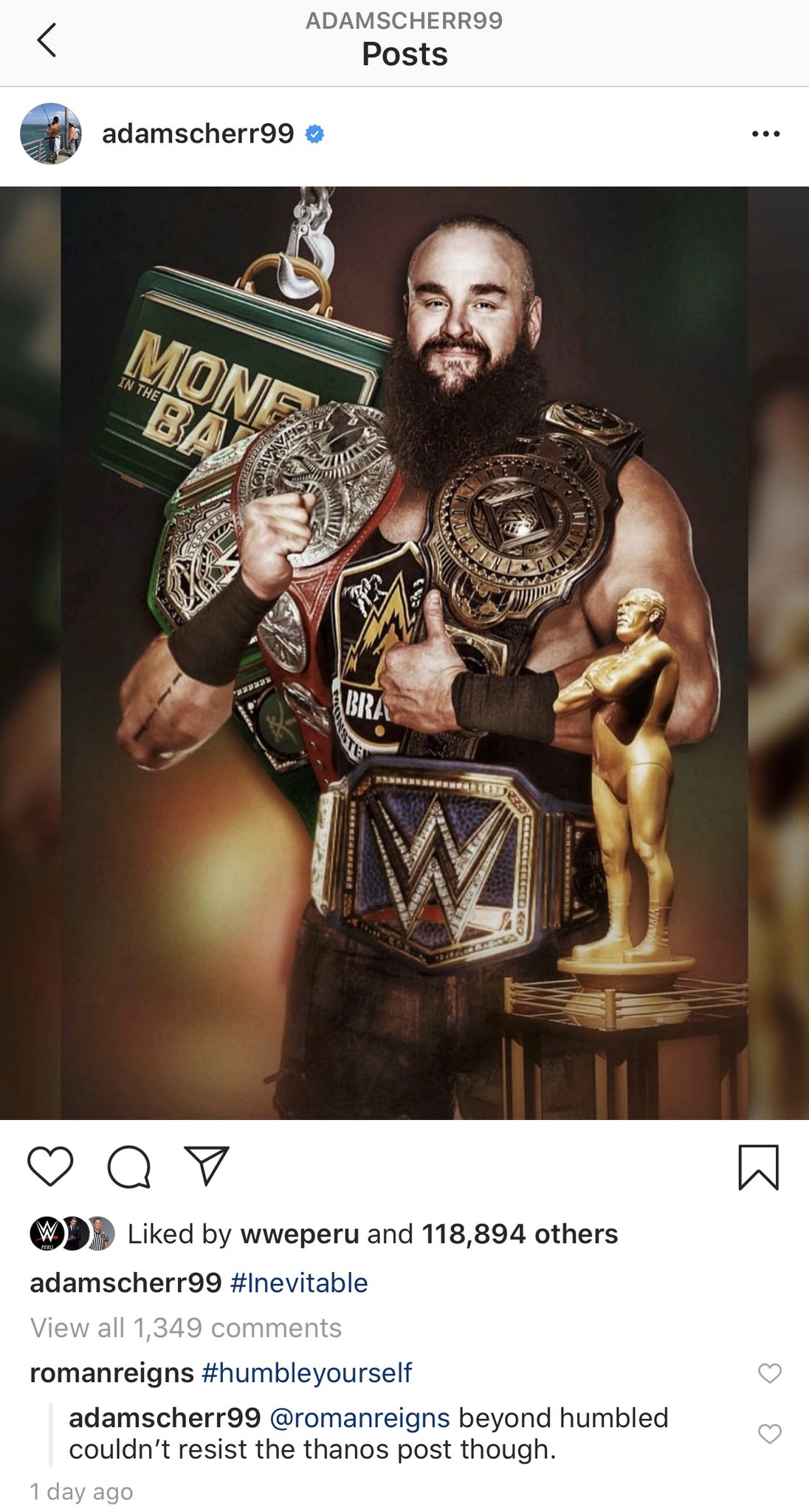 Strowman replied to his comment with a reference to the Marvel villain, Thanos. He wrote, "Beyond humbled, couldn't resist the Thanos post though."