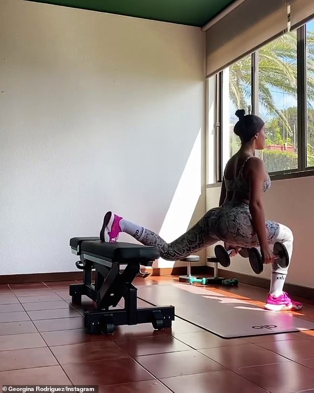 Cristiano Ronaldo's girlfriend, 26, showcased her sensational figure as she wore tight-fitting gym gear to completed the single-leg squats while holding weights.