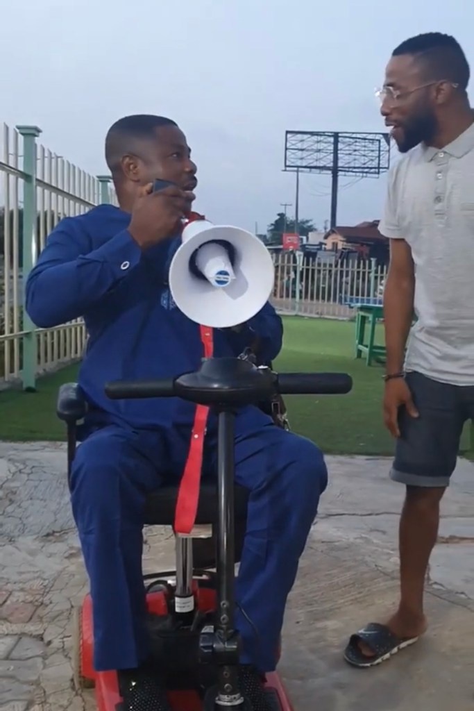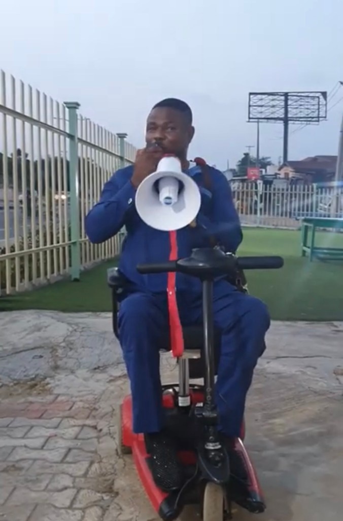In the video, the very talented singer who is also the owner of high flying radio station, Fresh F.M., is seen sitting on his motorised wheelchair,carrying an arm bag and holding a megaphone to his mouth as he bellow to people to come and patronise the “Aporo Epa Ijebu” that he is selling.