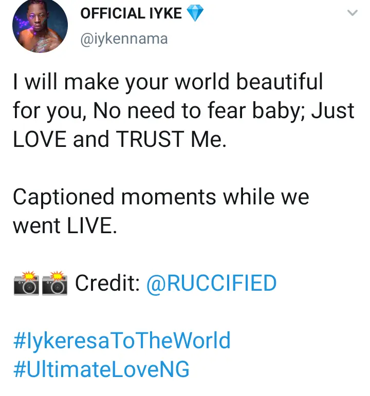 Sharing a photo on Twitter, Iyke took to his official account and stated that he would make Theresa world to beautiful just like her face.