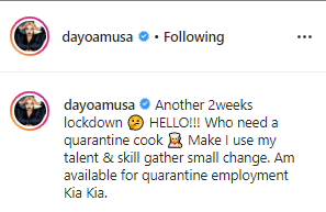 In her words “Another 2weeks lockdown 🤔 HELLO!!! Who need a quarantine cook 👩🍳 Make I use my talent & skill gather small change. Am available for quarantine employment Kia Kia.”