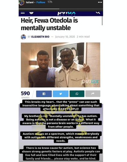 Billionaire, Otedola’s daughter, Tolani has called out a journalist identified as Elizabeth Bio for describing her autistic brother as mentally unstable.