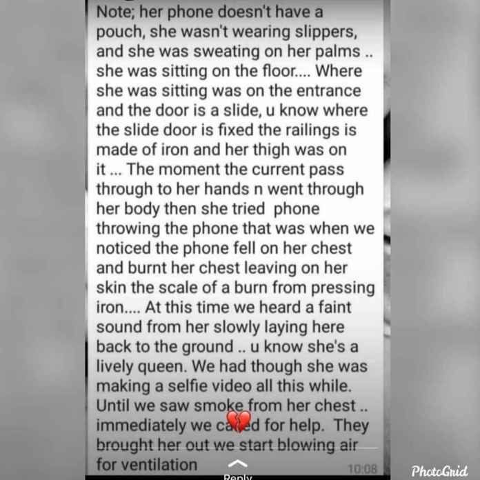throwing the phone that was when we noticed the phone fell on her chest and burnt her chest leaving on her | skin the scale of a burn from pressing iron…. At this time we heard a faint . sound from her slowly laying here back to the ground .. u know she’s a lively queen. We had though she was making a selfie video all this while.
