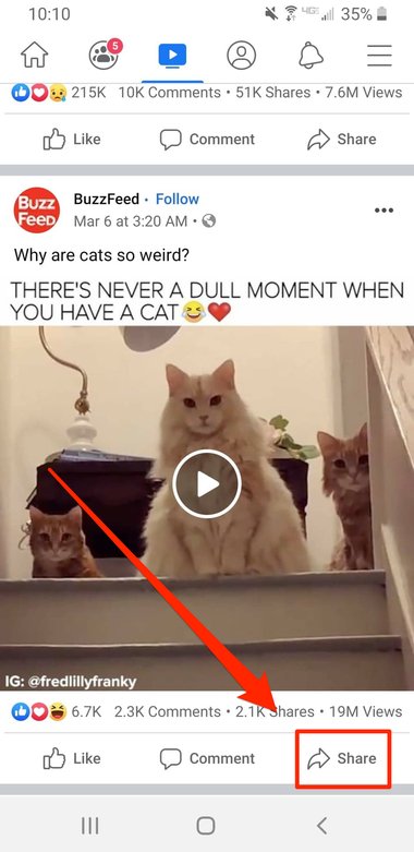 1. Open the Facebook app on your iPhone or Android. When you have found a video you want to share, tap on the "Share" button underneath the video.