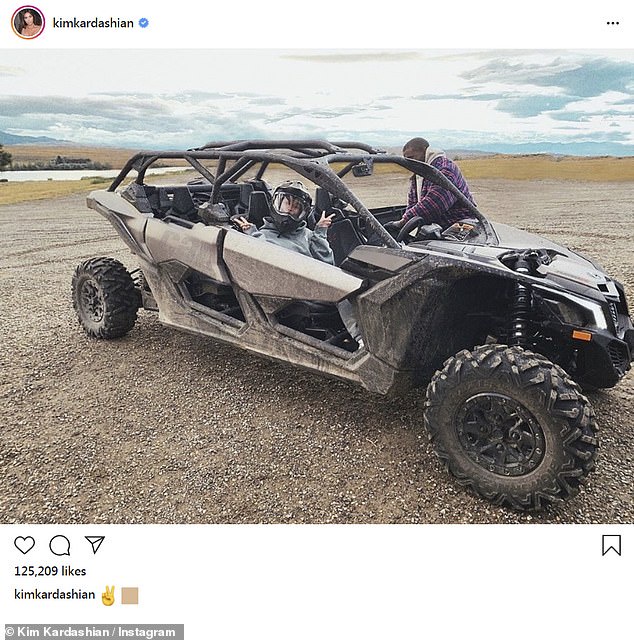 Captioning the image with a peace sign, Kim sat in the driving seat, wearing a helmet, while Kanye, 42, posed on the side of the vehicle.