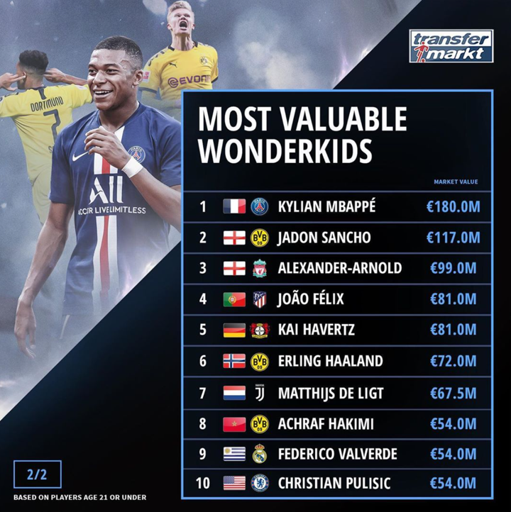 According to Transfermarkt, Kylian Mbappe, who is currently the most valuable player, leads the list with a market value of €180m as most valuable youngster.