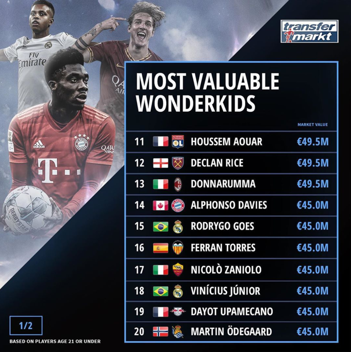 Meanwhile Borussia Dortmund's Jadon Sancho and Liverpool's Alexander-Arnold follow with €117m and €99m.