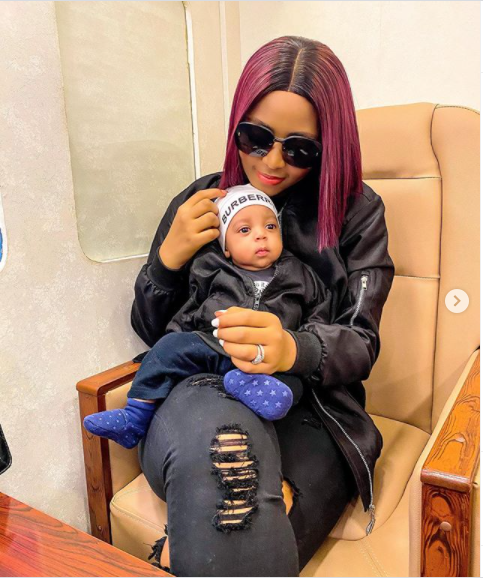 Nollywood actress, Regina Daniels and her son, Munir Ned Nwoko, dressed in matching outfits.