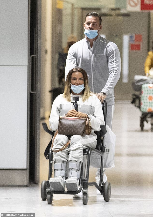 Carl, 31, pushed Katie, 42. around in her wheelchair, after she broke both her feet while jumping off a wall in Turkey a couple of months before.
