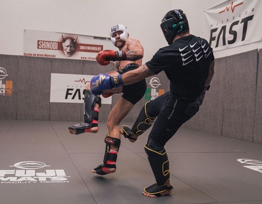 McGregor posted a couple of pictures showing him practicing spinning head kicks, apparently at the Shinobi Academy School of Mixed Martial Arts in Lagos, Portugal.
