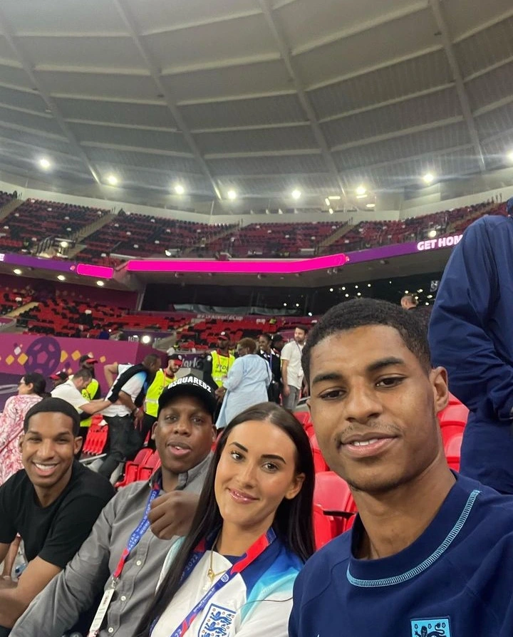 Marcus Rashford was snapped posing with his girlfriend in their 3-0 win over Wales in their final group game of FIFA World Cup.