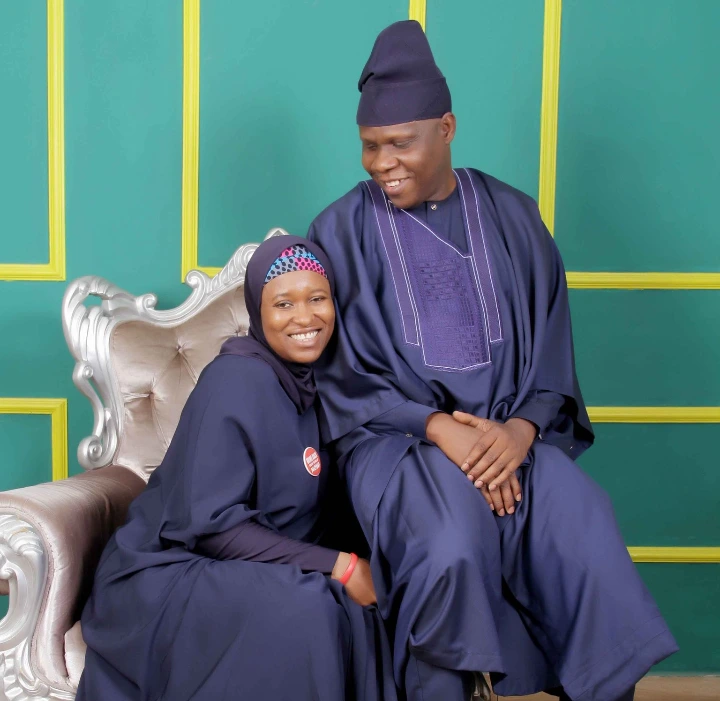 From the image, she sat comfortably on a chair beside her husband who was seen sitting on the edge as he rocked his traditional attire.