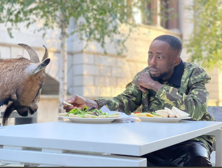 Erigga could be seen feeding the goat who gazed at him food from thr photo.
