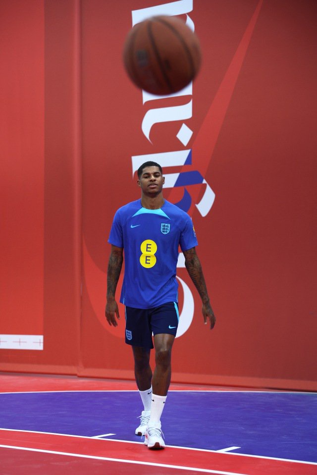 Manchester United forward Marcus Rashford looked focused for the game. He took part in shooting into the hoops in the basketball.