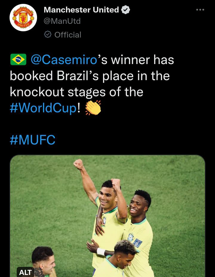 The 31 years old goal for Brazil caught the attention of his club, Manchester United. Reacting to the late strike from Casemiro, Manchester United tweeted