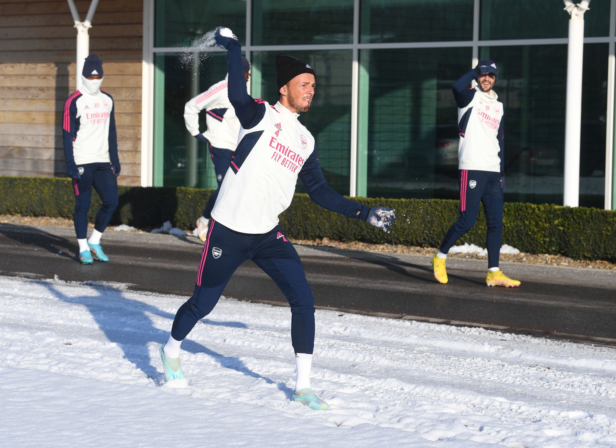 Arsenal defender, Benjamin White was spotted throwing snowballs. White left England's World Cup squad early and is now back with his club.