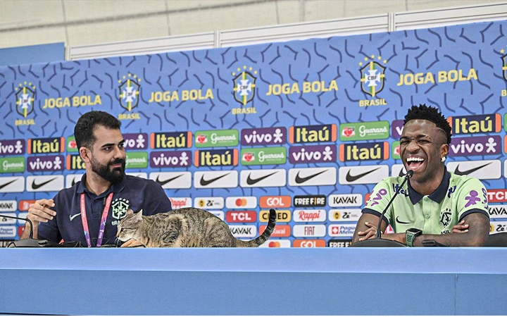 A cat interrupted Vinicius Junior media conference ahead of Brazil quarter-final clash with Croatia.
