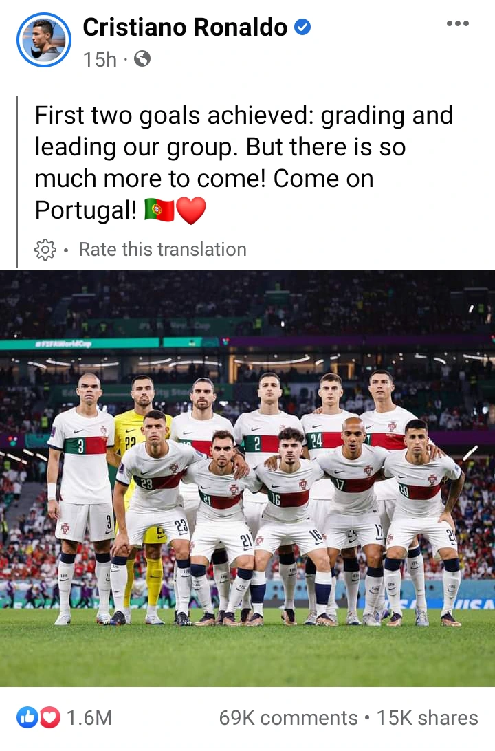 Cristiano Ronaldo, a world-renowned football player, took to his Facebook page on Friday to praise Portugal's excellent performance.