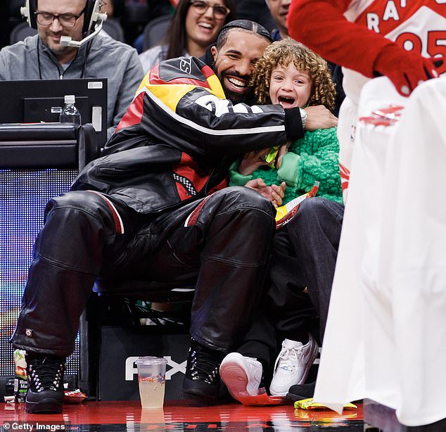 The Passionfruit rapper stood out in Toronto's Scotiabank Arena, sitting right next to the NBA action and beaming alongside his young son while dressed to the nines in a flashy jacket.