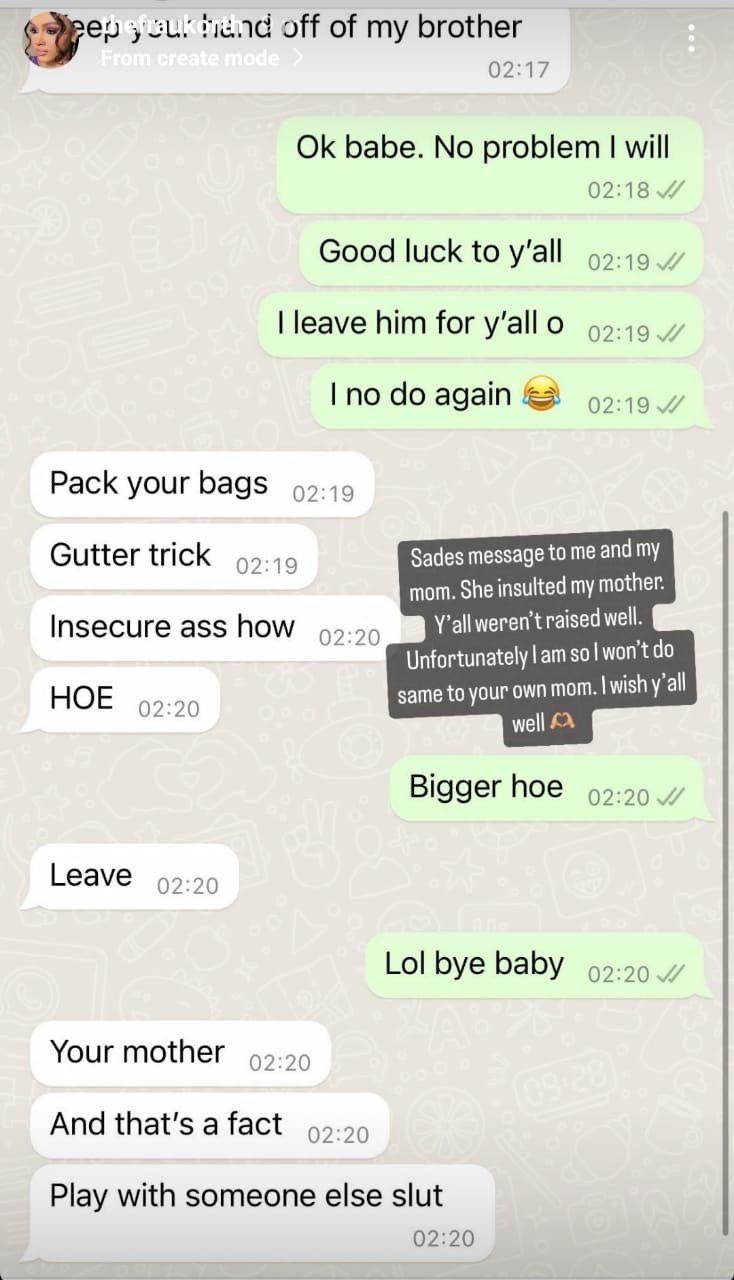 Then, she tweeted a screenshot of her conversation with Sina and his sister, Sade, in which she claimed that Sina had insulted her mother.