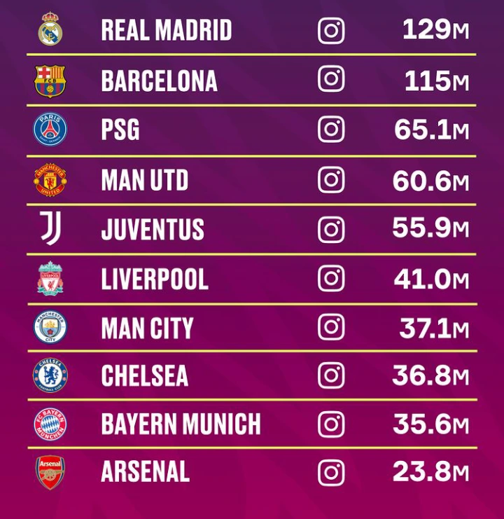 1. Real Madrid: The Spanish side lead the ranks for the most followed club. 129 million Real Madrid fans follow them on Instagram. Due to their success in European competitions like the UEFA Champions League and La Liga, they have gained more fans.