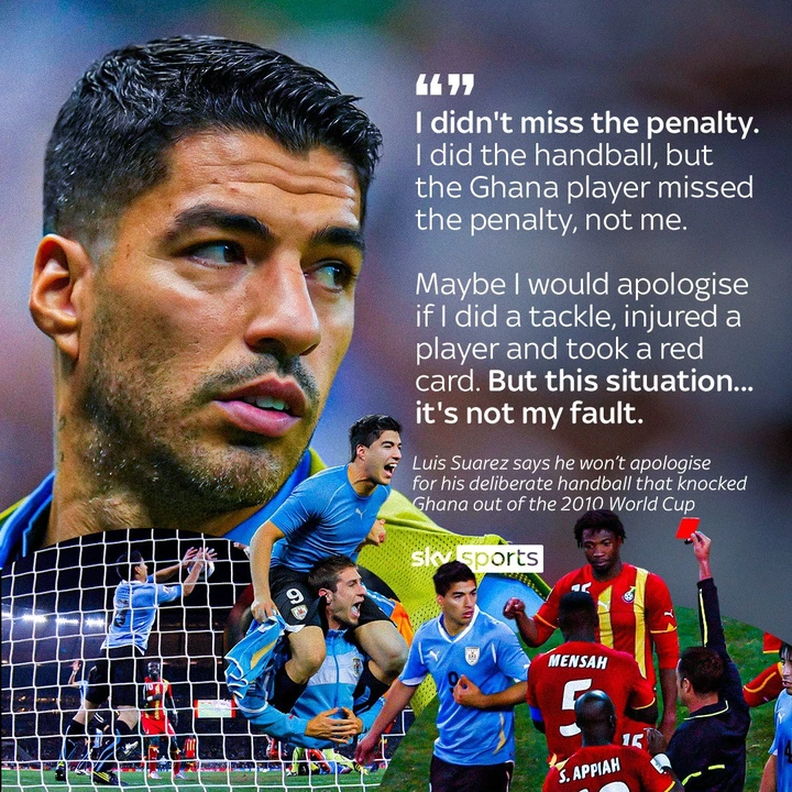 On the ball, Luis Suarez has clarified that he has no great explanation to apologize for what happened the last time Uruguay face Ghana on the planet cup since he isn't the person who missed the punishment after he was shipped off.