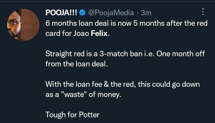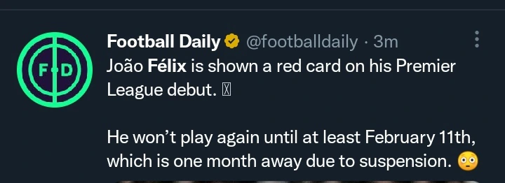 Joao Felix was given a straight red card when he made his debut, which suggests that the youngster would need to play three games.As a result, Felix won't play against Liverpool, Fulham, or Crystal Palace. He will play against West Ham United on February 11th.