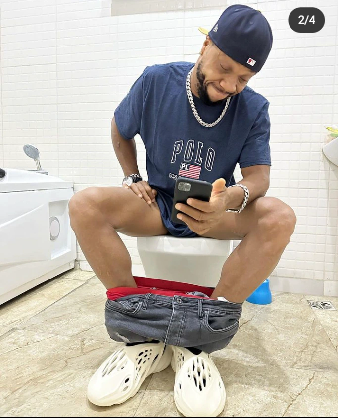 While taking the pictures, Charles Okocha was spotted grinning while sitting in the restroom.
