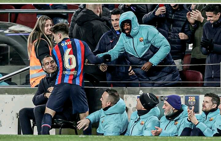 Gavi ran to the stands to celebrate his goal with an injured Ousmane Dembele after scoring Barcelona's second goal against Sevilla.