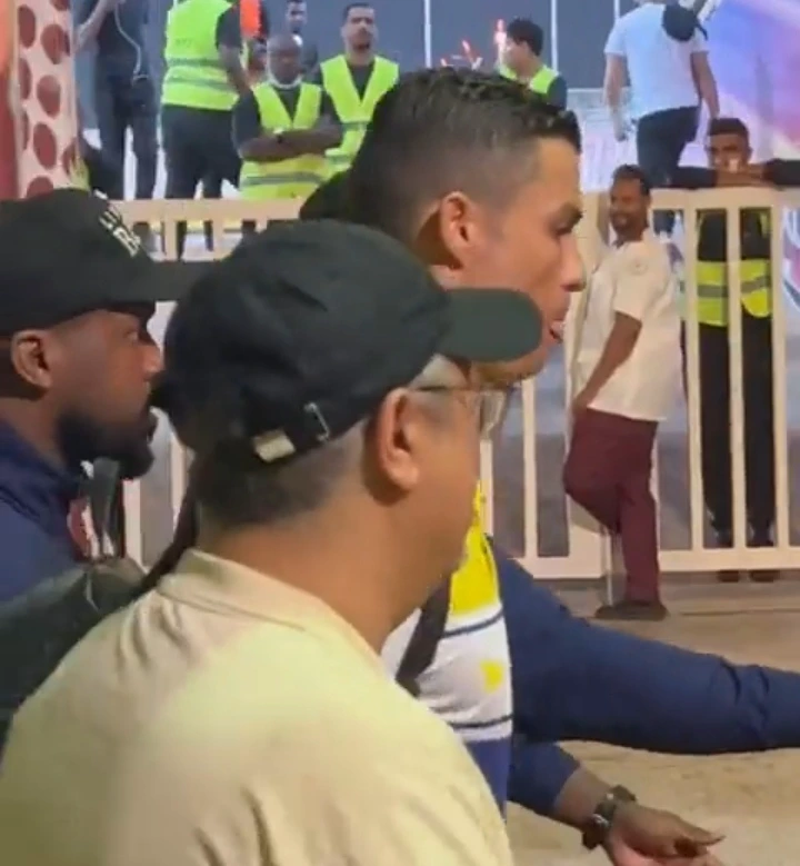 Cristiano Ronaldo was guided by several security operatives as he left the stadium following his stunning performance for Al Nassr.