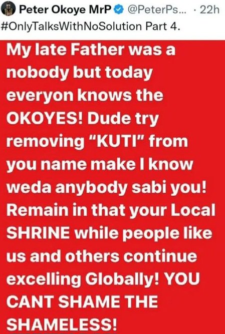 The P-Square duo's Peter claimed that his father was a "Nobody" before making a name for himself during his altercation with Seun Kuti.