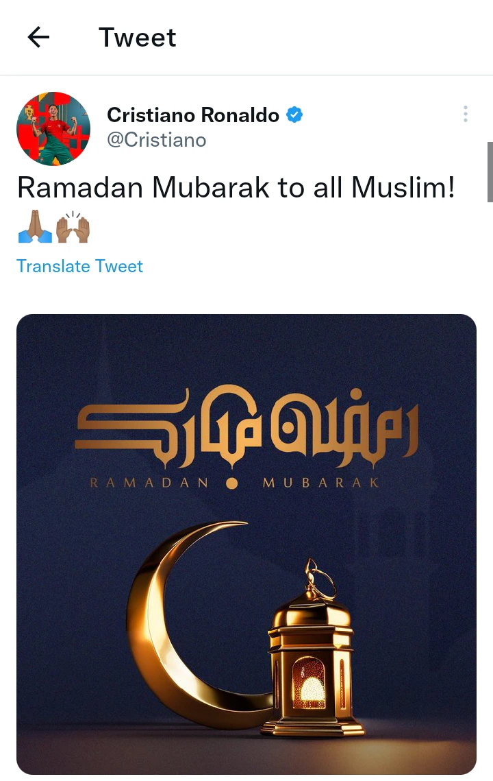 The Portugal national team captain tweeted: "Ramadan Mubarak to all Muslims!"