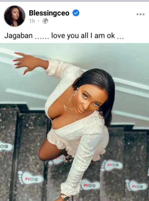 Blessing CEO introduced herself as Jagaban on her verified Facebook page and assured her followers that she was OK and that she loved them.