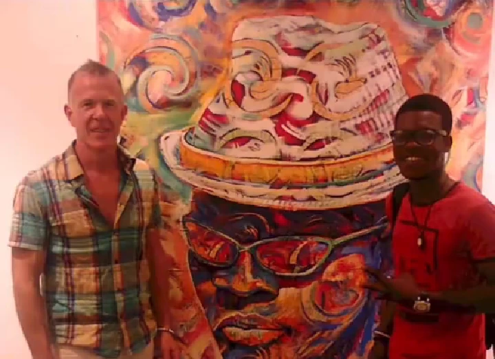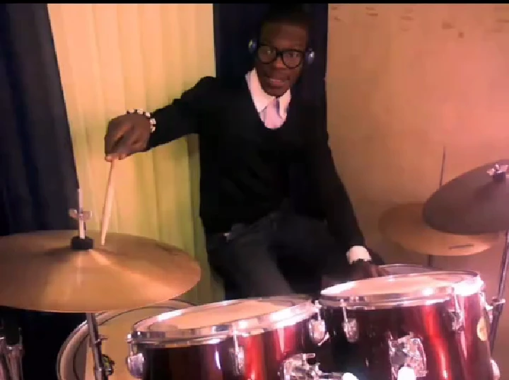 He was captured on camera playing the drums. Another displays some of his artwork.