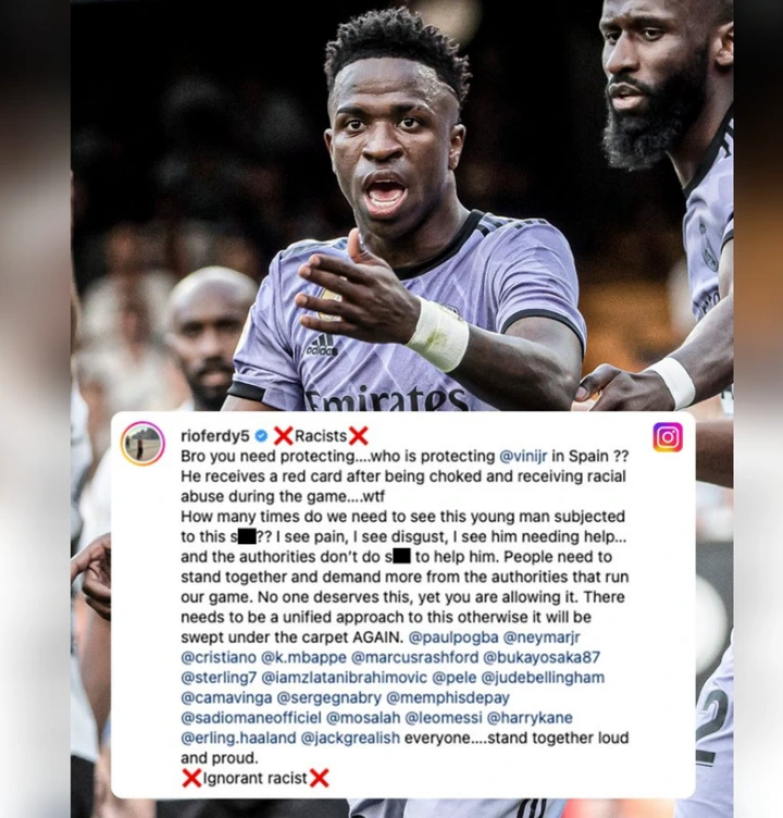 Rio Ferdinand, a former player for Manchester United, urged other football players to speak out against racism and support Vinicius Jr.