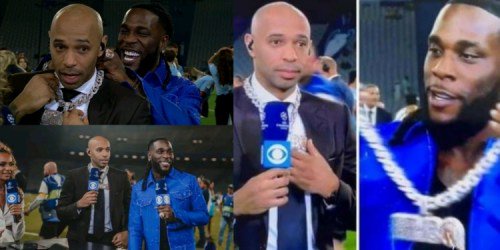 In footage posted online, Burnaboy can be seen putting Thierry Henry's neck around his "Gambo" diamond necklace when they are being questioned after the UCL match between Manchester City and Inter Milan.