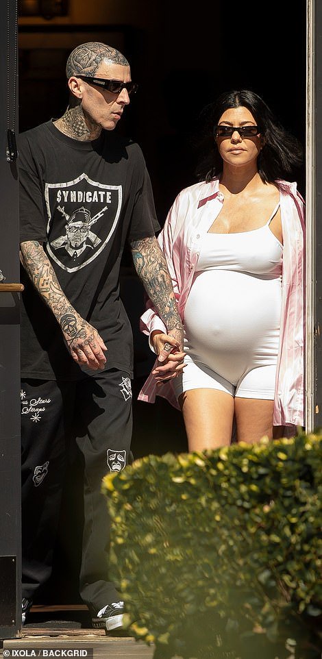 Kourtney Kardashian, 44, flaunts her pregnant belly in a tight-fitting maternity bodysuit while out for a romantic walk with husband Travis Barker, 47, in Santa Barbara.
